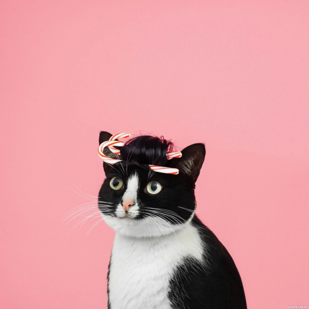 red bows on either side of its head, giving the impression that it has ears. This adds a playful and humorous element to the image. The cat's eyes are open wide and its expression could be interpreted as surprised or curious.