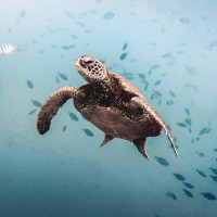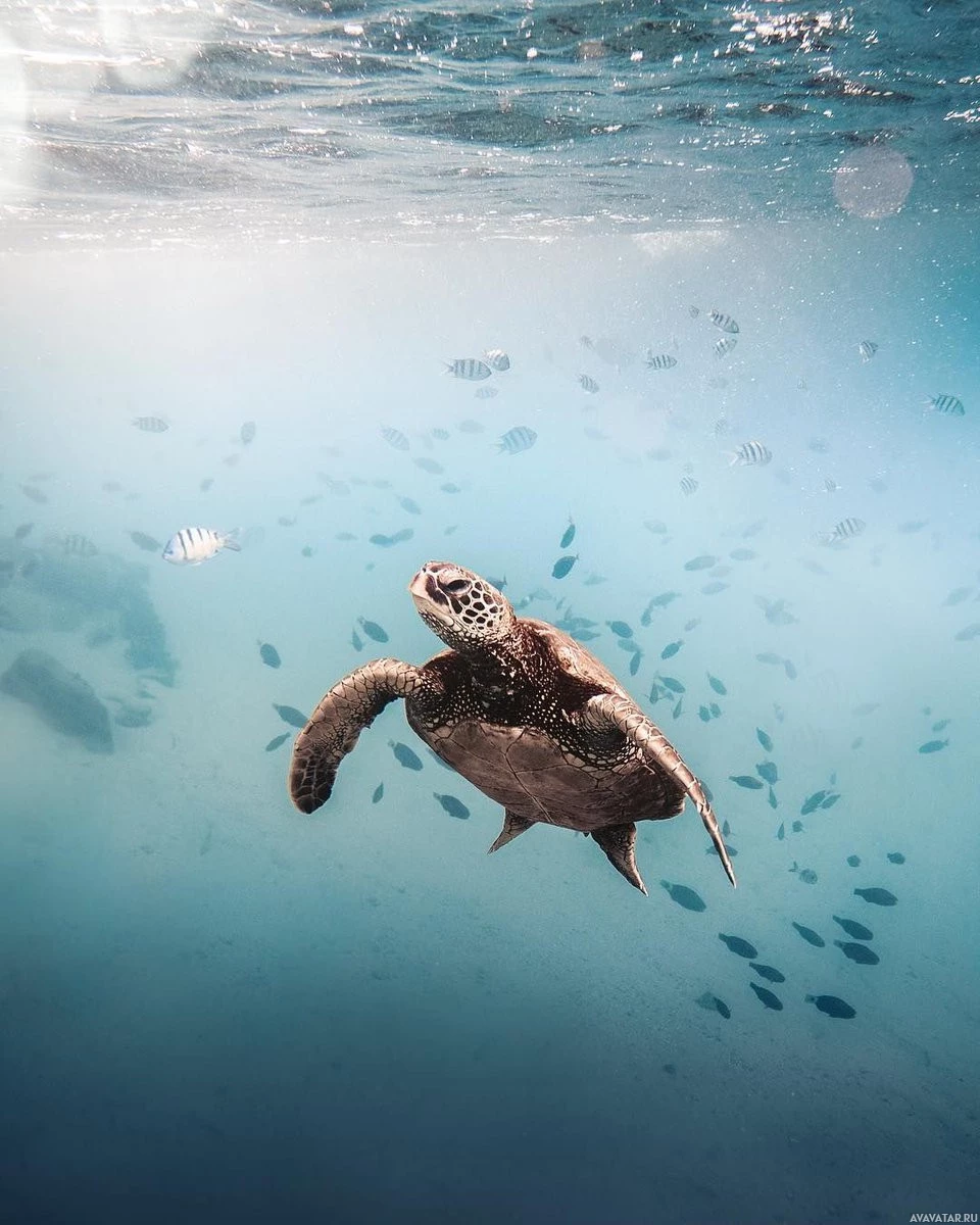 На снимке изображена морская черепаха, плавающая под водой. Вокруг черепахи видно несколько рыб, что позволяет предположить, что она находится в морской среде, где сосуществуют различные виды.