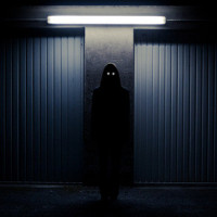The image shows a darkened scene with the silhouette of a figure standing in the center, facing away from the viewer. The lighting is coming from behind the figure, creating a dramatic contrast between the dark surroundings and the illuminated backdrop. It appears to be taken at night or in a dimly lit area. There's also an element of mystery due to the silhouette effect.