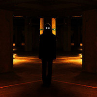 The image shows a silhouette of a person in the center, standing against a background that appears to be an industrial or warehouse-like environment. The lighting is dim and moody, creating a sense of isolation or mystery about the individual's identity or purpose for being there.