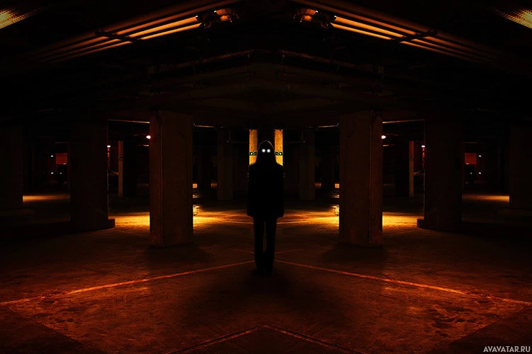На картинке изображен силуэт человека в центре, стоящего на фоне, который кажется промышленной или складской средой. Освещение тусклое и капризное, создавая ощущение изоляции или тайны о личности человека или цели его пребывания там.