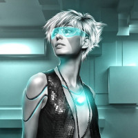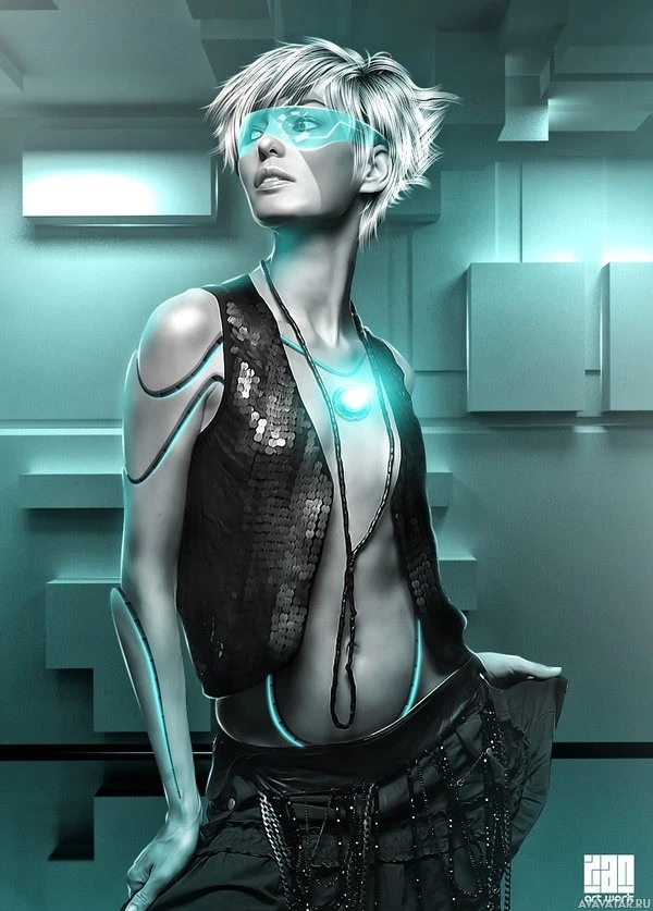 blonde hair, is wearing glasses that cover her eyes, and has what appears to be cybernetic enhancements or technology integrated into her body. Her clothing has a high-