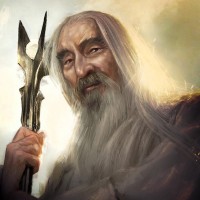 The image features a character from the "The Lord of the Rings" universe, specifically known as Saruman. He is depicted with long