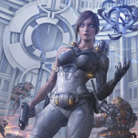 Картинка показывает женского персонажа, который, кажется, находится в научно-фантастической обстановке. Она носит футуристическую броню и держит то, что кажется продвинутым пистолетом или оружием. Вокруг нее находятся различные роботизированные существа, напоминающие зомби или дронов. Окружающая среда предполагает сцену битвы с передовыми технологиями, что свидетельствует о научно-фантастическом повествовании.