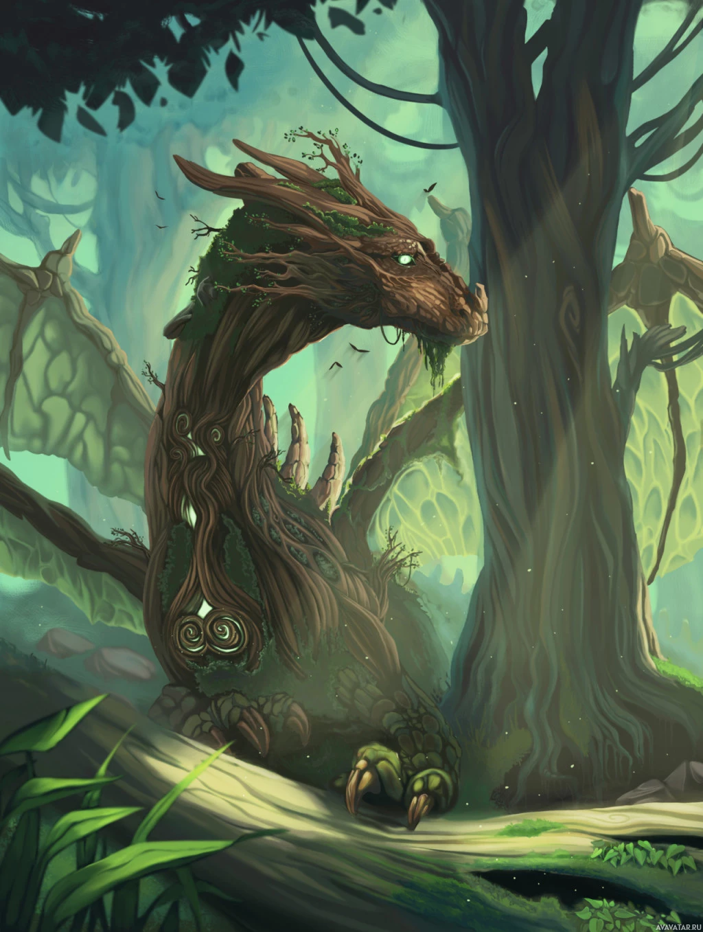 The image depicts a fantasy-themed artwork featuring a dragon. This particular dragon is unique in that it has been integrated with a tree, giving the appearance of