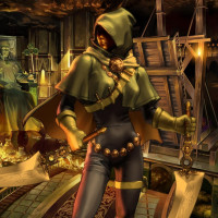 intricate jewelry that adds to her mystique or status within the setting depicted in the image. The environment around her appears to be richly decorated with various items and possibly