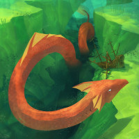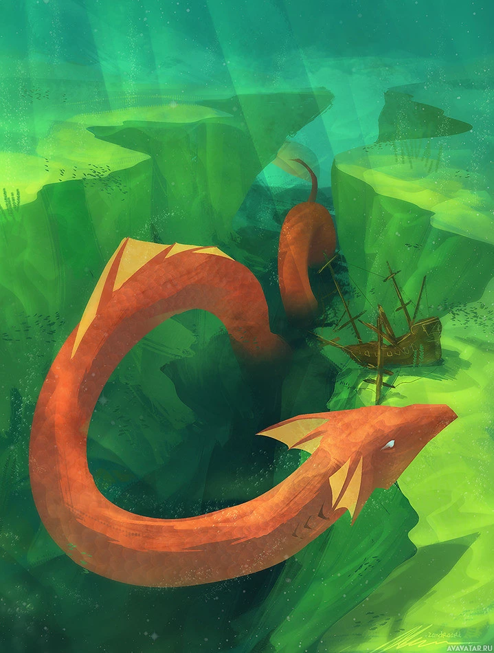 a fantasy scene with two red dragons swimming near the bottom of a body of water, possibly an underwater valley. One dragon is closer to the surface while the other is slightly deeper. Above them, there appears to be a shipwreck or submerged boat structure that suggests this might be taking place in an area where such ruins are common, perhaps due to frequent storms or