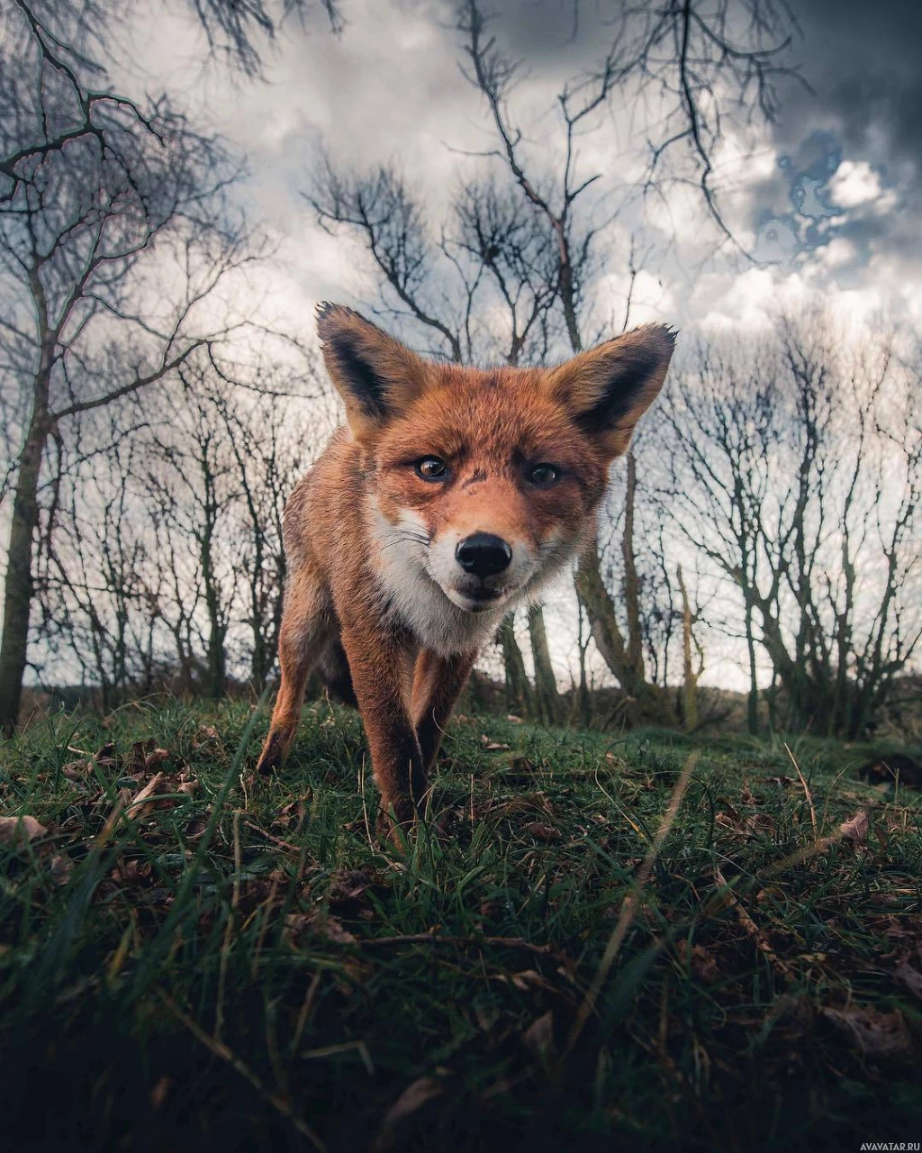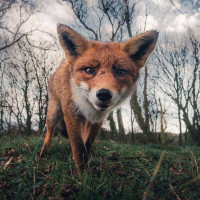 a red fox standing on grassy ground, possibly in an outdoor setting with trees and bushes. The fox appears to be looking directly at the camera, giving it a somewhat intense or focused expression. There is