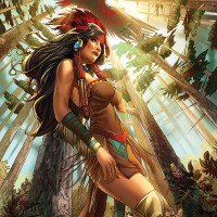 dark hair with a feather in it, and she is looking upward towards the sky or sunlight filtering through the trees. Above her head, there is