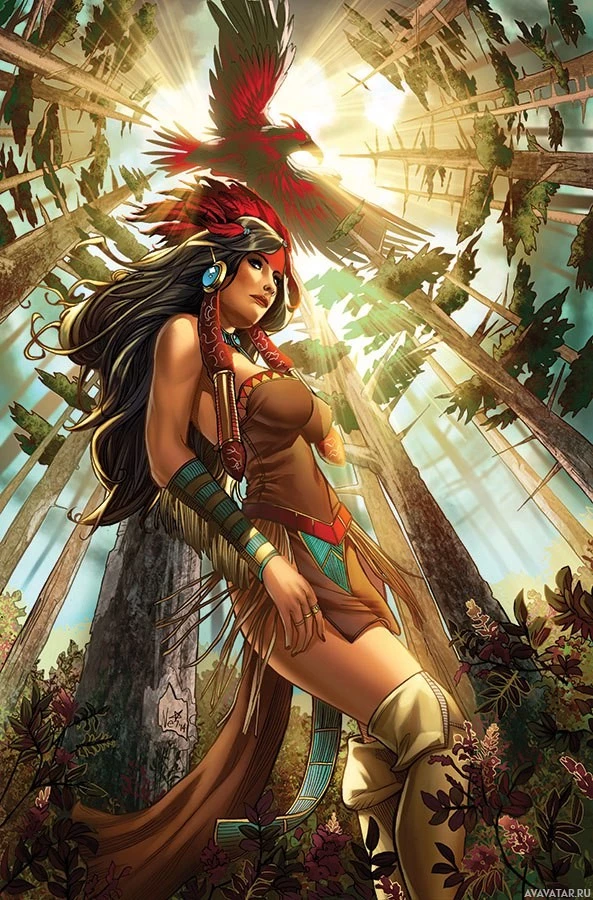The image shows a woman in what appears to be Native American attire, standing amidst