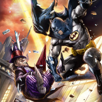 Comics universe. In the foreground, we see Batman and Robin engaged in combat against a character who appears to be the Joker,