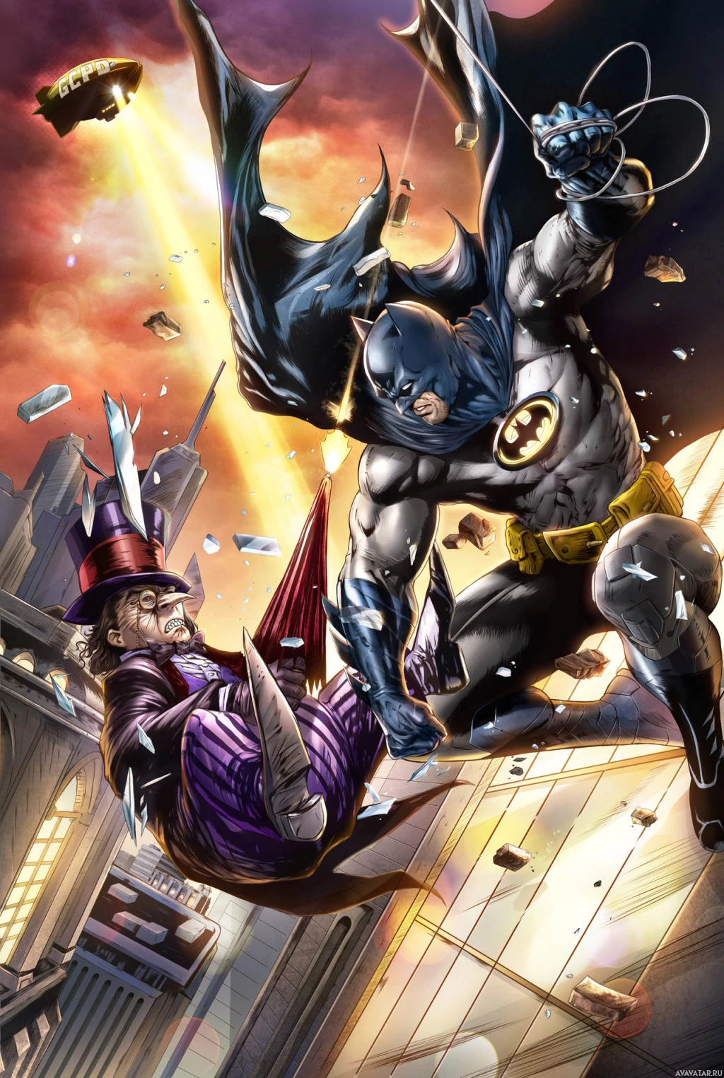 a classic villain of Batman's rogues gallery. Batman is on the left, holding a batarang (his