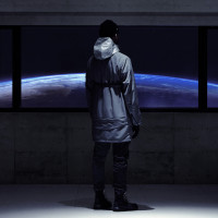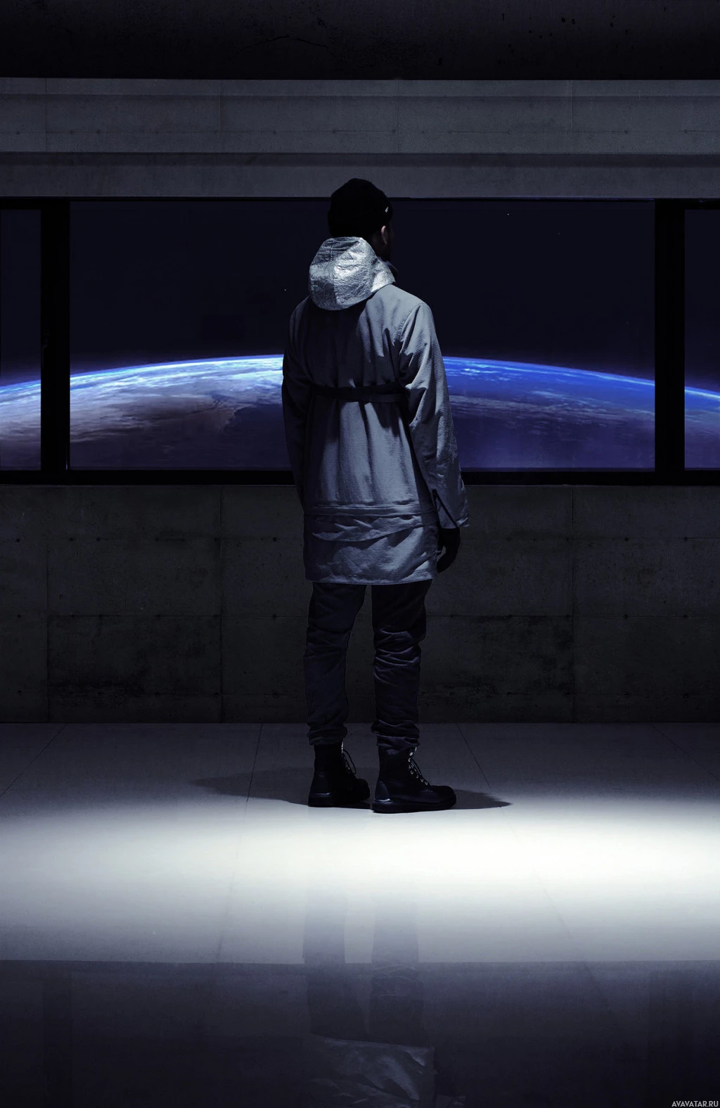 outer space. The individual is wearing a hoodie and seems to be contemplating or observing the planet from this unique perspective. The atmosphere suggests a sense of wonder or reflection about our planet from a distant