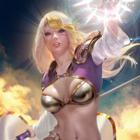 a female character dressed in fantasy armor, suggesting she is part of a game or a story set within the fantasy genre. She appears to be standing amidst a dramatic backdrop, possibly a battlefield given the presence of what looks like explosions or magical