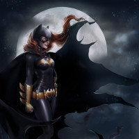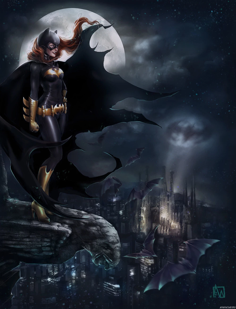 the Batman universe. She is standing on what appears to be a gargoyle or statue of a bat, which is characteristic of her costume's design that incorporates bats as part of her emblem. The background features