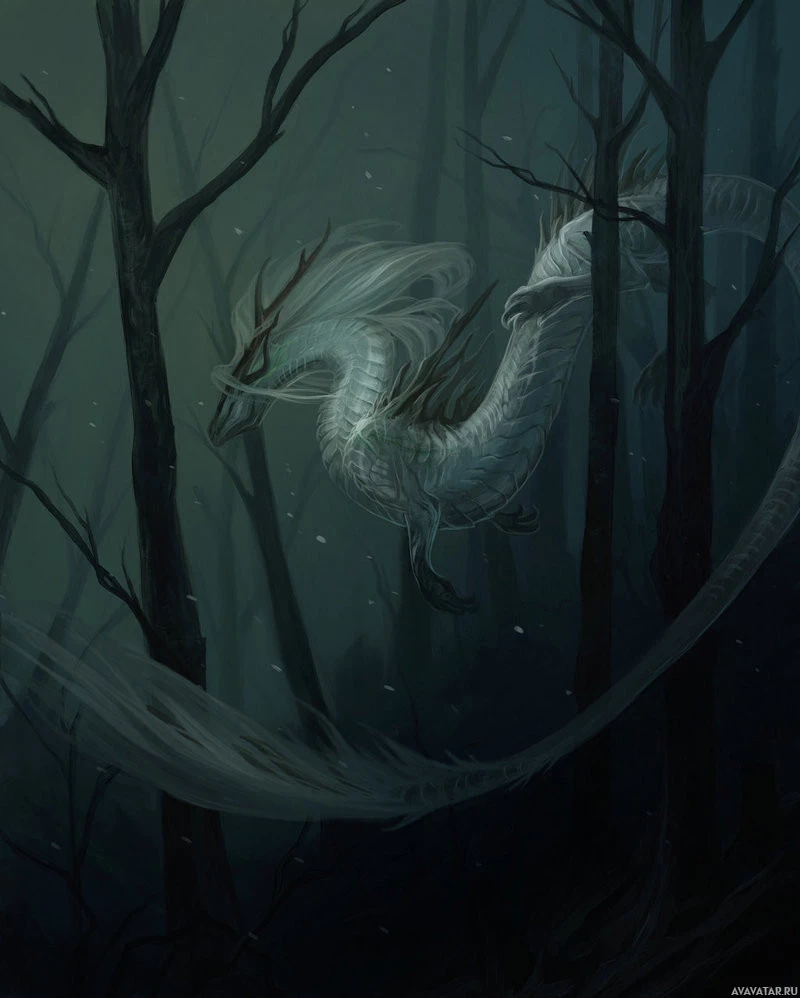 На картинке изображена сцена фэнтези с участием дракона. Дракон с широко растянутыми крыльями пролетает сквозь густой лес, заполненный деревьями и окутанный тьмой. Место действия таинственно и эфирно, вызывая атмосферу волшебного или мистического леса из фантастической сказки.