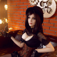 a cosplay outfit that resembles a vintage or steampunk style. They are wearing a corset,