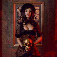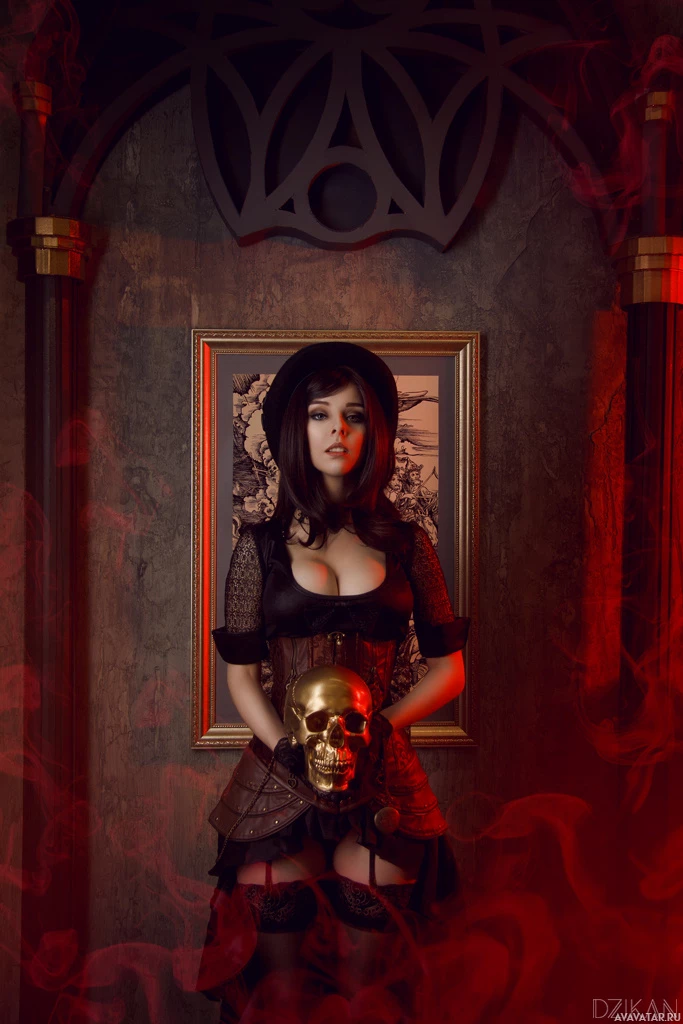 an elaborate costume that resembles historical attire with elements of fantasy or gothic styles. They are holding what appears to be a skull, which may suggest a character from