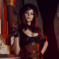 a cosplay costume inspired by historical or fantasy elements. They are wearing a hat and an elaborate outfit that could suggest a character from a historical period, perhaps Victorian, with a touch of the supernatural given the dark surroundings and