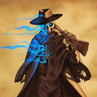 The image depicts a character that appears to be a cowboy with a distinctive