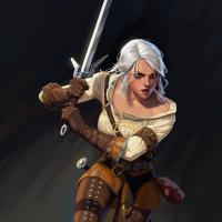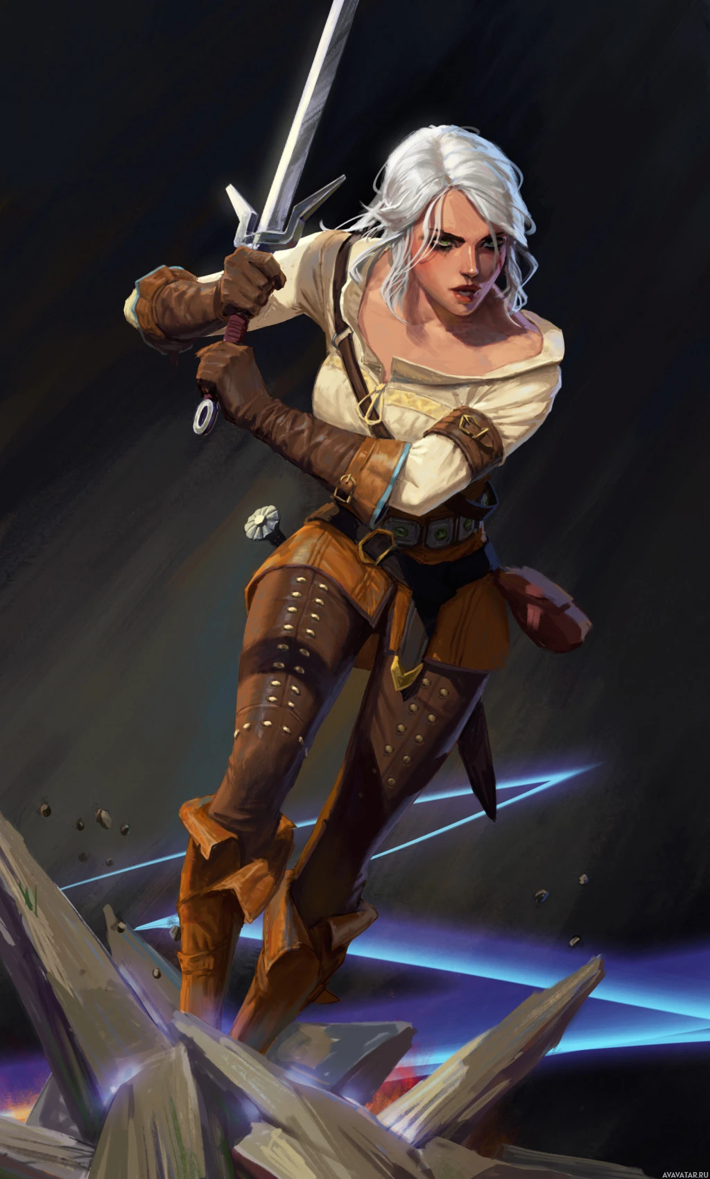 На картинке изображен женский персонаж из видеоигры «Ведьмак 3: Дикая Охота», известной как Чири. Она изображена со светлыми волосами, в доспехах и с мечом. Ее выражение предполагает решительность или готовность к бою.