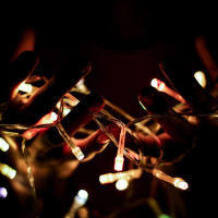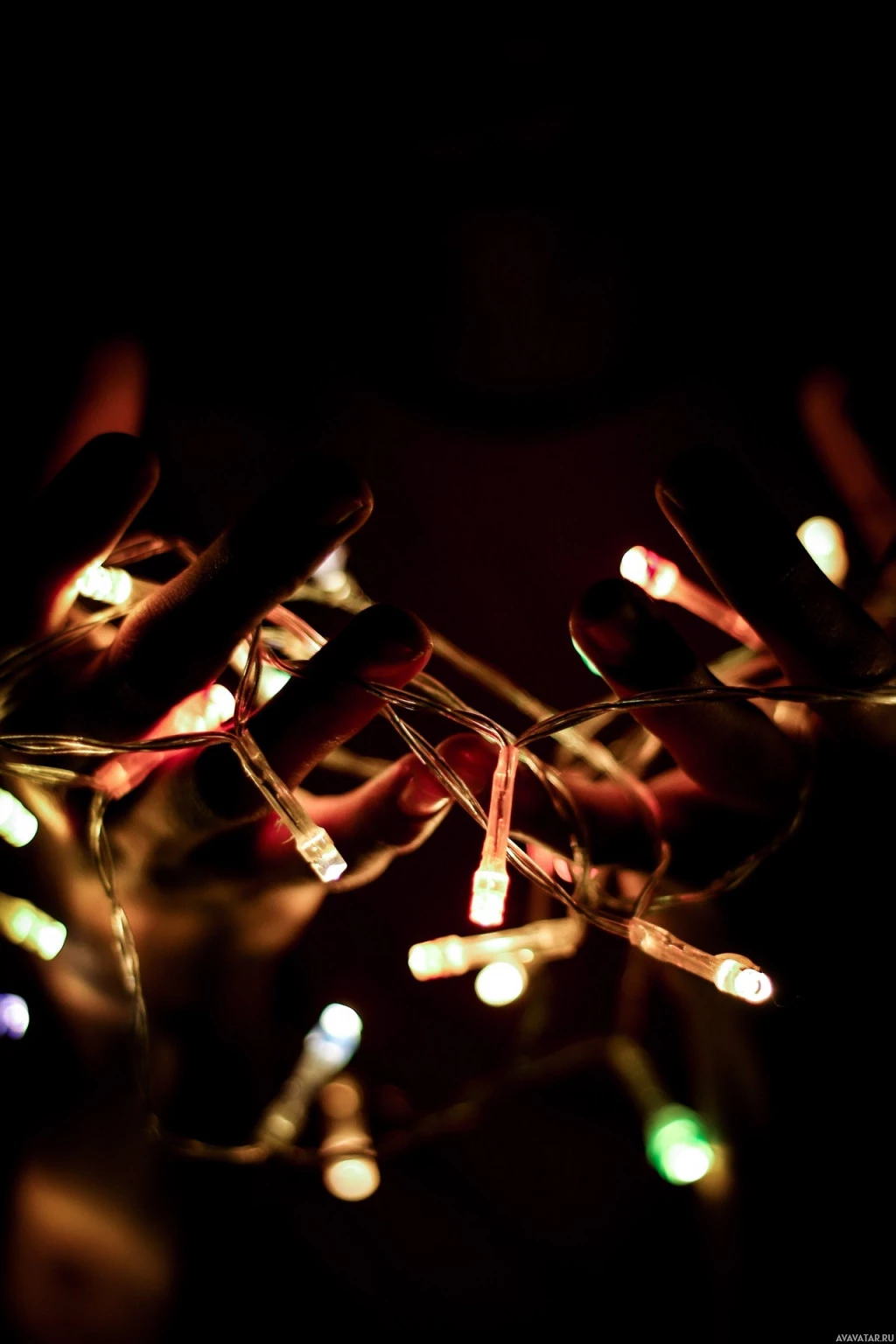 На картинке изображена пара рук, держащая вереницу красочных рождественских огней. Фон темный, что обеспечивает контраст с освещенными огнями. В струне видны по крайней мере шесть лампочек с различными цветами, которые могут включать красный, зеленый и другие праздничные оттенки.
