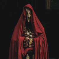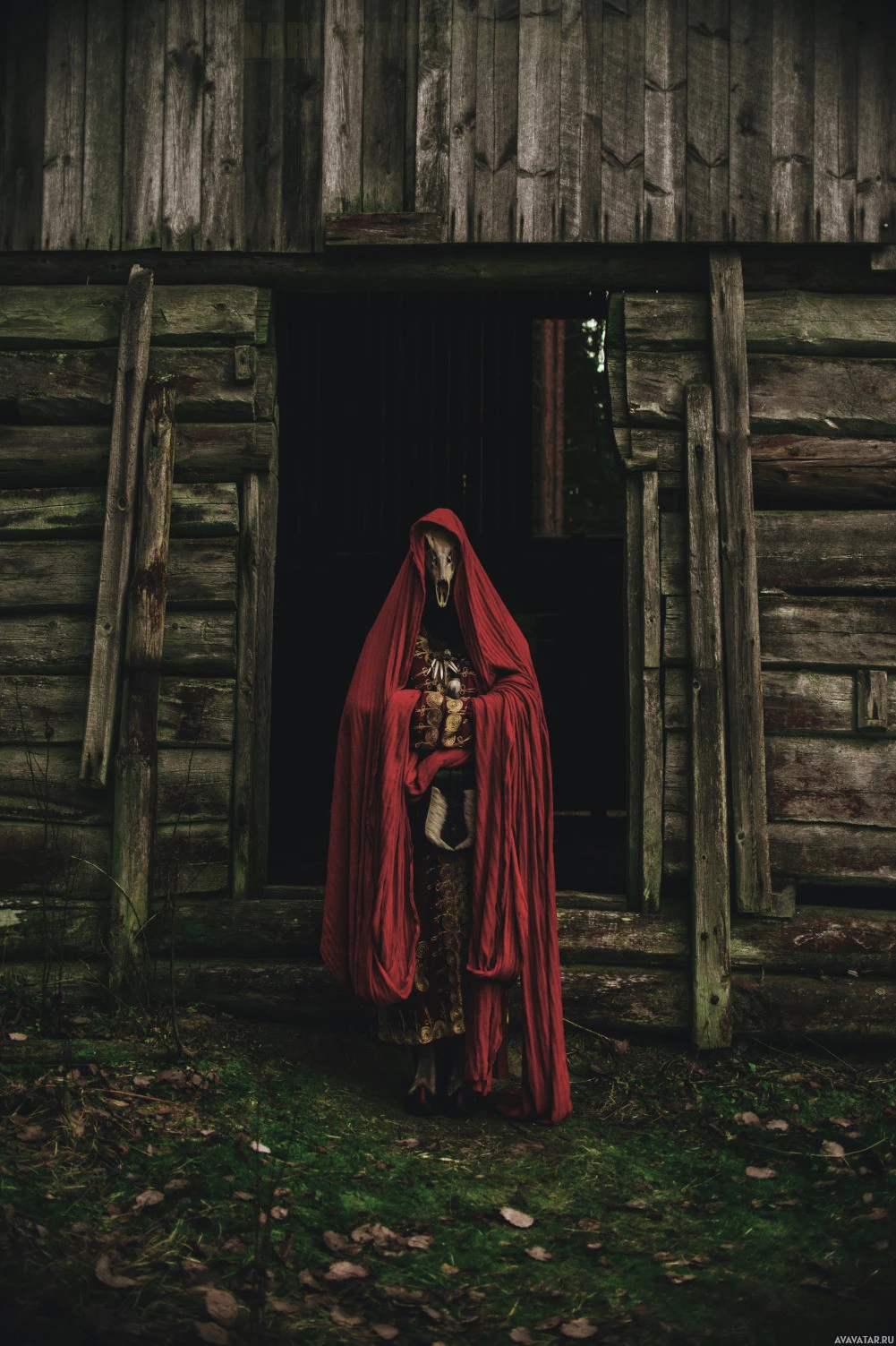 red cape or cloak that drapes over their shoulders and covers part of their face, giving them an enigmatic or possibly menacing appearance. They are looking out of the structure towards the viewer. The overall atmosphere of the image is eerie and could be described as "horror" due to the ominous setting and the person's attire, which might evoke