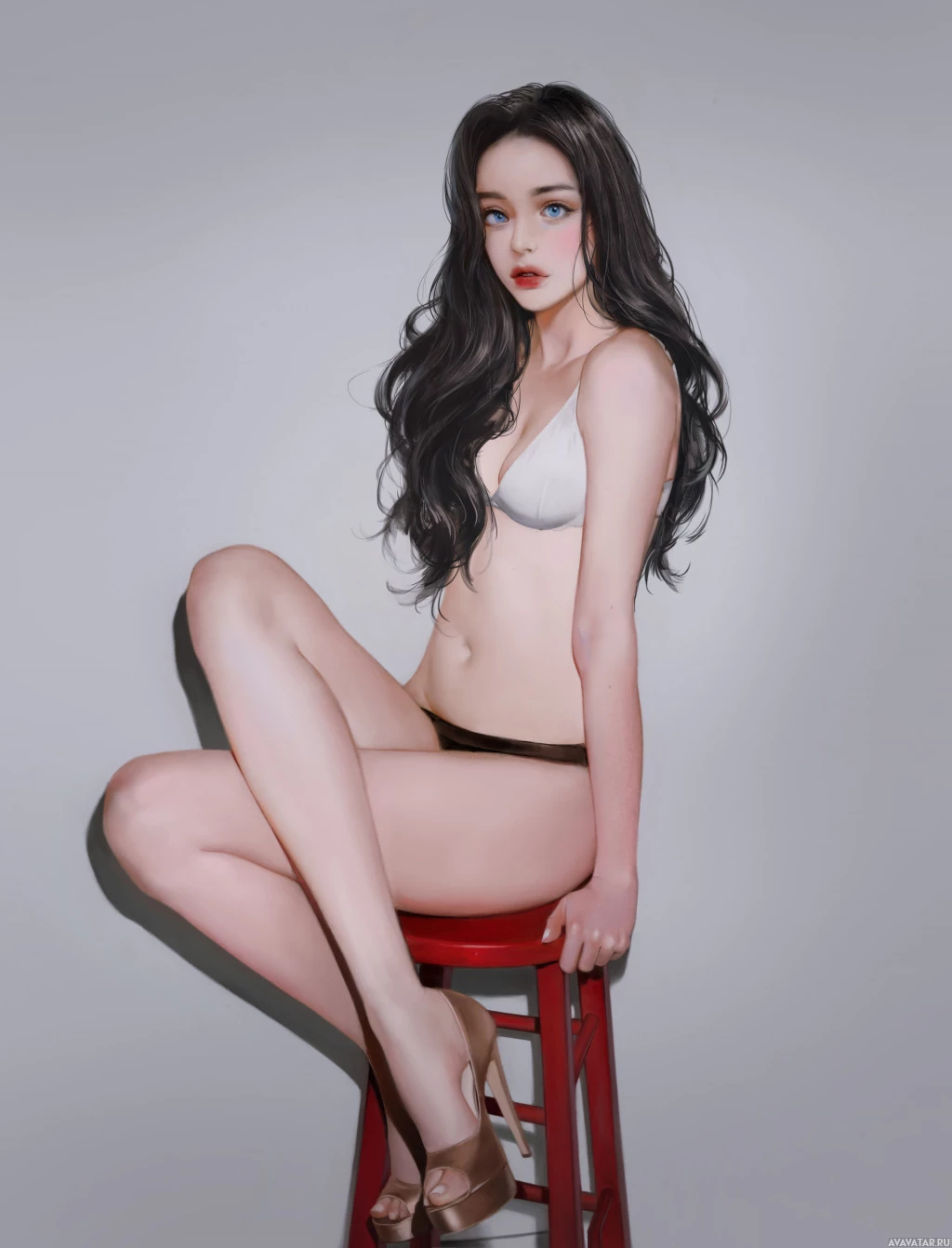 The image shows a digital rendering of a woman sitting on a stool. She has long,