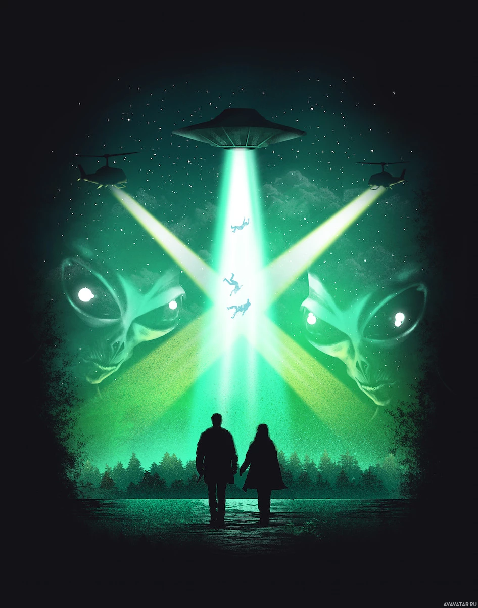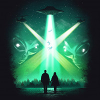 flying object (UFO) in the top left corner, and a searchlight effect emanating from it, illuminating the silhouettes and casting light on them. The overall tone of the image conveys