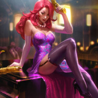 high heels, sitting on a piano bench in what appears to be a lounge or club setting. There are cocktails on the table in front of her, suggesting she might be posing for a photo. The character has an elegant and stylish appearance, which is typical of