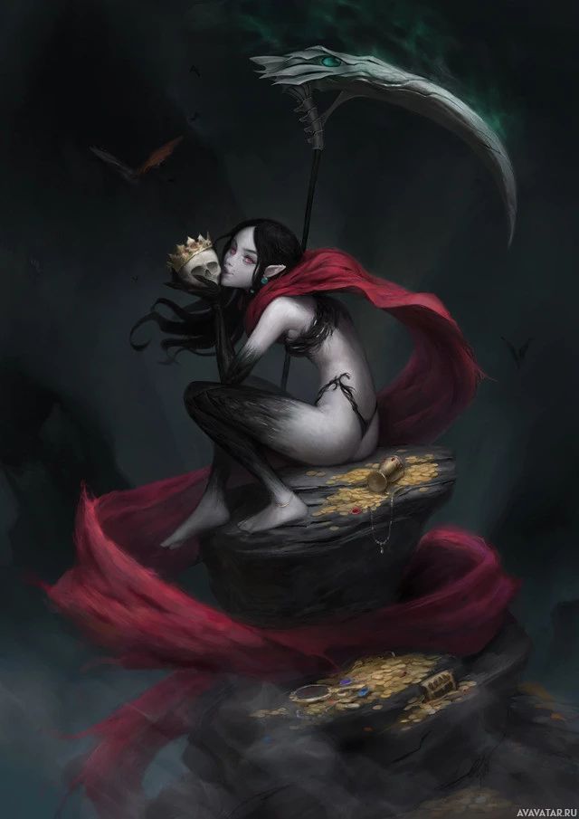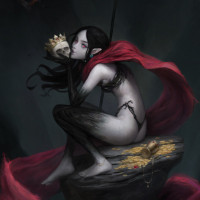gold coins scattered around her feet and what looks like a gem or crystal nearby. The overall mood of the artwork is quite eerie and mysterious, evoking themes commonly associated with fantasy or