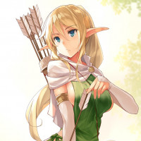 fantasy attire, resembling the style of clothing often associated with elves or archers in fantasy settings. In her hands, she holds a bow and arrow, suggesting that she might be depicted as