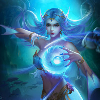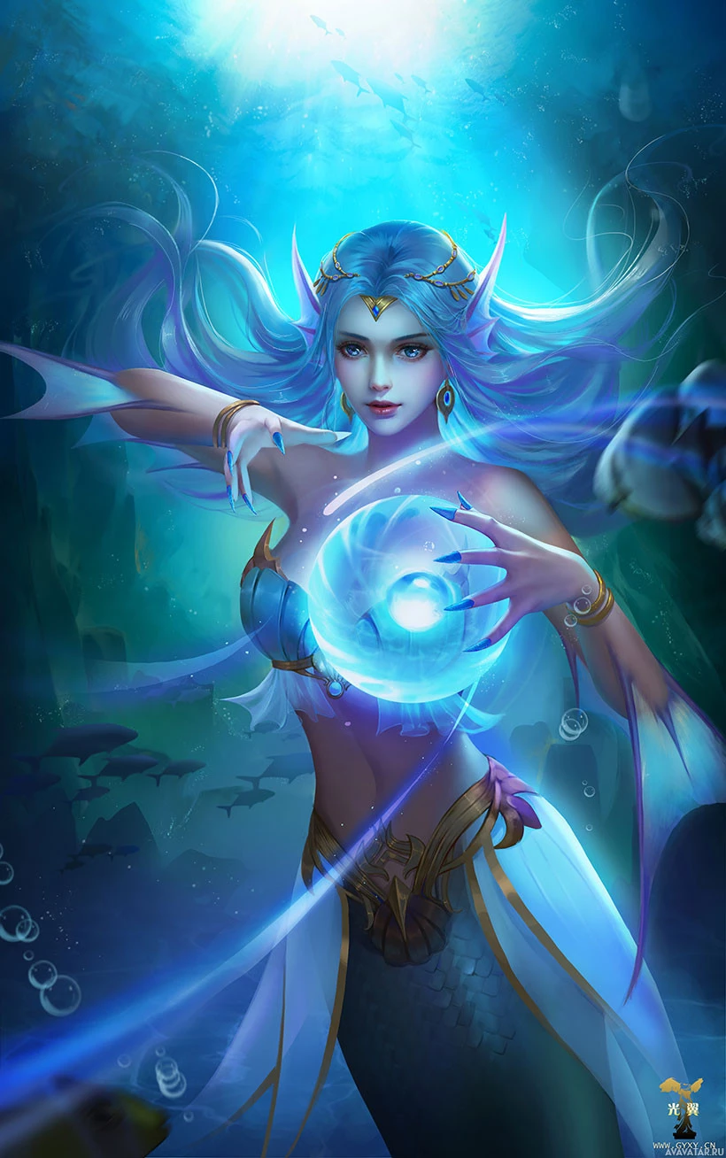 long hair and is wearing a tail that resembles that of a fish or aquatic creature. The mermaid appears to be underwater, with bubbles and seaweed visible around her. In one hand, she holds