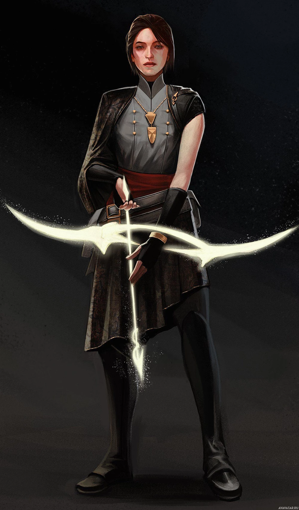 female character dressed in what appears to be historical or fantasy-themed clothing. She is holding what looks like an arrow in one hand and a bow in the other, suggesting that she might be preparing for archery or warfare within her context. The artwork is detailed and gives the impression of a character from