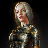 blonde hair and is wearing armor with gold accents, which suggests she may have a role as a powerful figure or leader within her story's context. The armor has