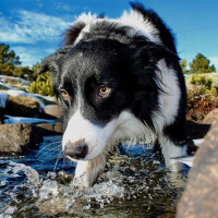 a Border Collie, drinking from a stream. The dog appears to be focused on the water, possibly catching fish as
