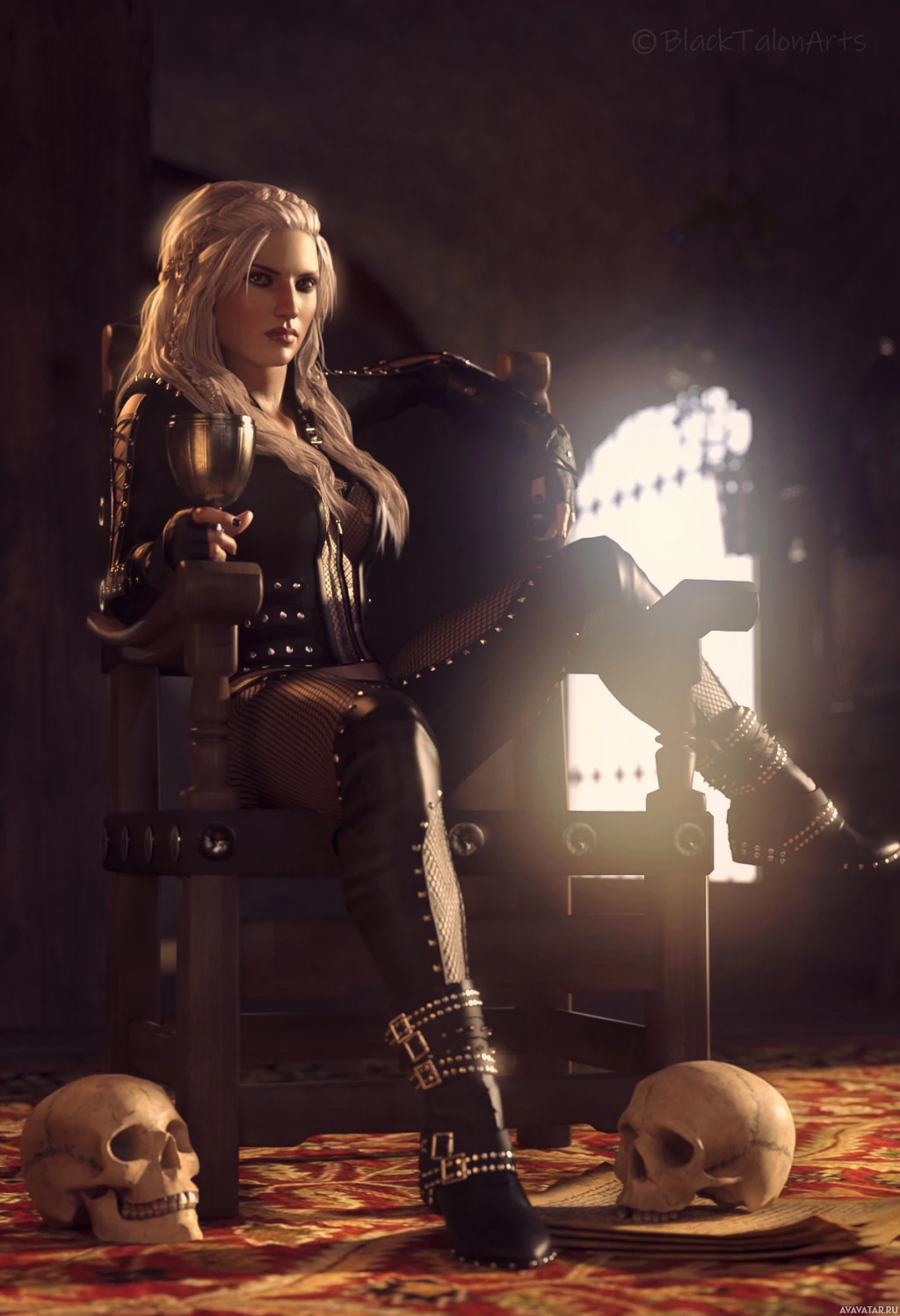 a serious expression on her face and is seated in what looks like a medieval setting, possibly a throne room or a hall within a fortress or castle. In the foreground of the image are several skulls arranged artistically, which adds to the thematic