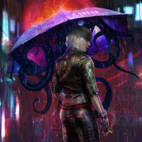 neon colors and appears to be rainy, which adds to the atmosphere of the scene.