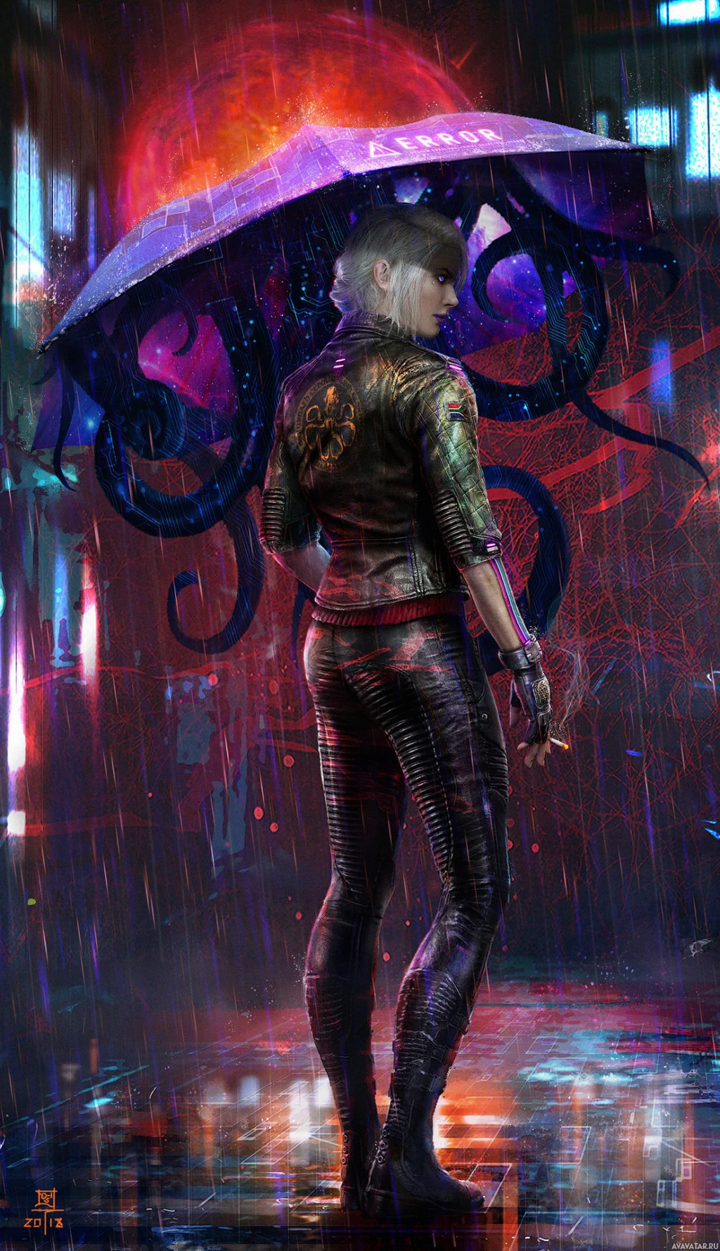 blonde hair, standing under an umbrella in what looks like a science fiction setting. She is wearing