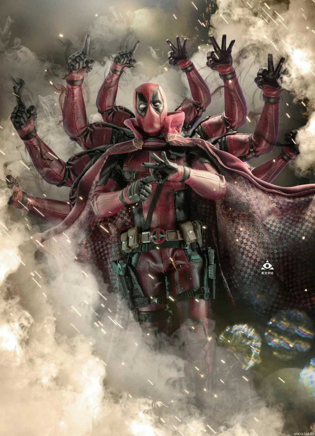 The image features a character known as Deadpool. He is depicted in his signature red and black costume, with a high-