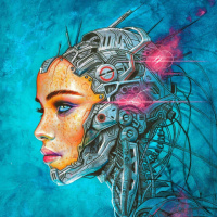 a female face. The robot's head is intricately designed, showing visible mechanical and electronic components such as gears, wiring, and circuitry. Its eyes are open and have a soft, almost human-like appearance. The background has a dark blue tone, which contrasts with the brighter colors of the robot's face and details, giving