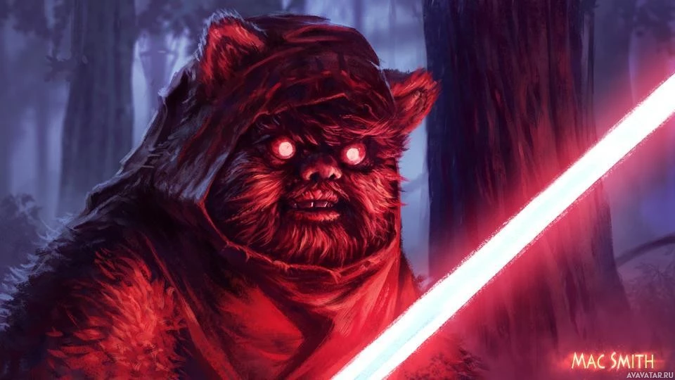 a red lightsaber, which is a signature weapon used by Jedi Knights and Sith Lords in "Star Wars." The character has a furry coat, pointed ears, and is wearing some sort of garment that could suggest a fantasy or