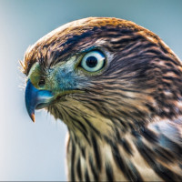 The image shows a bird, specifically an accipiter hawk. It is looking forward with its eye focused on something ahead of it. The background appears to be out of focus but suggests a natural environment that could be a park or forest.