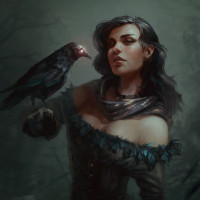 The image depicts a character that resembles Yennefer from the game "The Witcher". She is wearing a dress with dark, feather-like patterns and holding a small bird. The overall atmosphere suggests a mystical or enchanted setting, possibly within a fantasy universe.