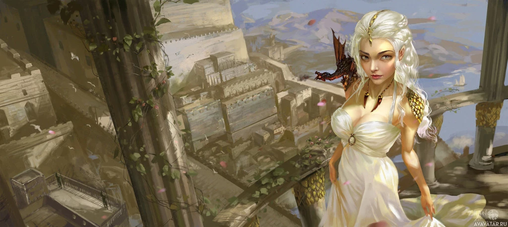 a prominent figure in the series' narrative. The image captures her standing in a ruined setting, possibly the remains of a temple or structure, with a dragon perched on her shoulder—a signature element from the show that symbolizes her character's connection to