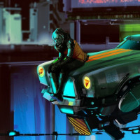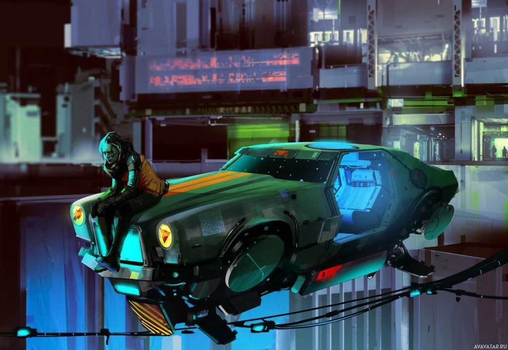 На картинке изображена сцена научной фантастики с участием девушки, сидящей на водительском сиденье необычного автомобиля. Автомобиль имеет футуристический дизайн с гладкими линиями и яркими цветами, предлагая передовые технологии или обстановку, которая не полностью основана на реальности. Окружающая среда вокруг них кажется ночным городским пейзажем со светящимся горизонтом, добавляющим потустороннюю атмосферу сцены.