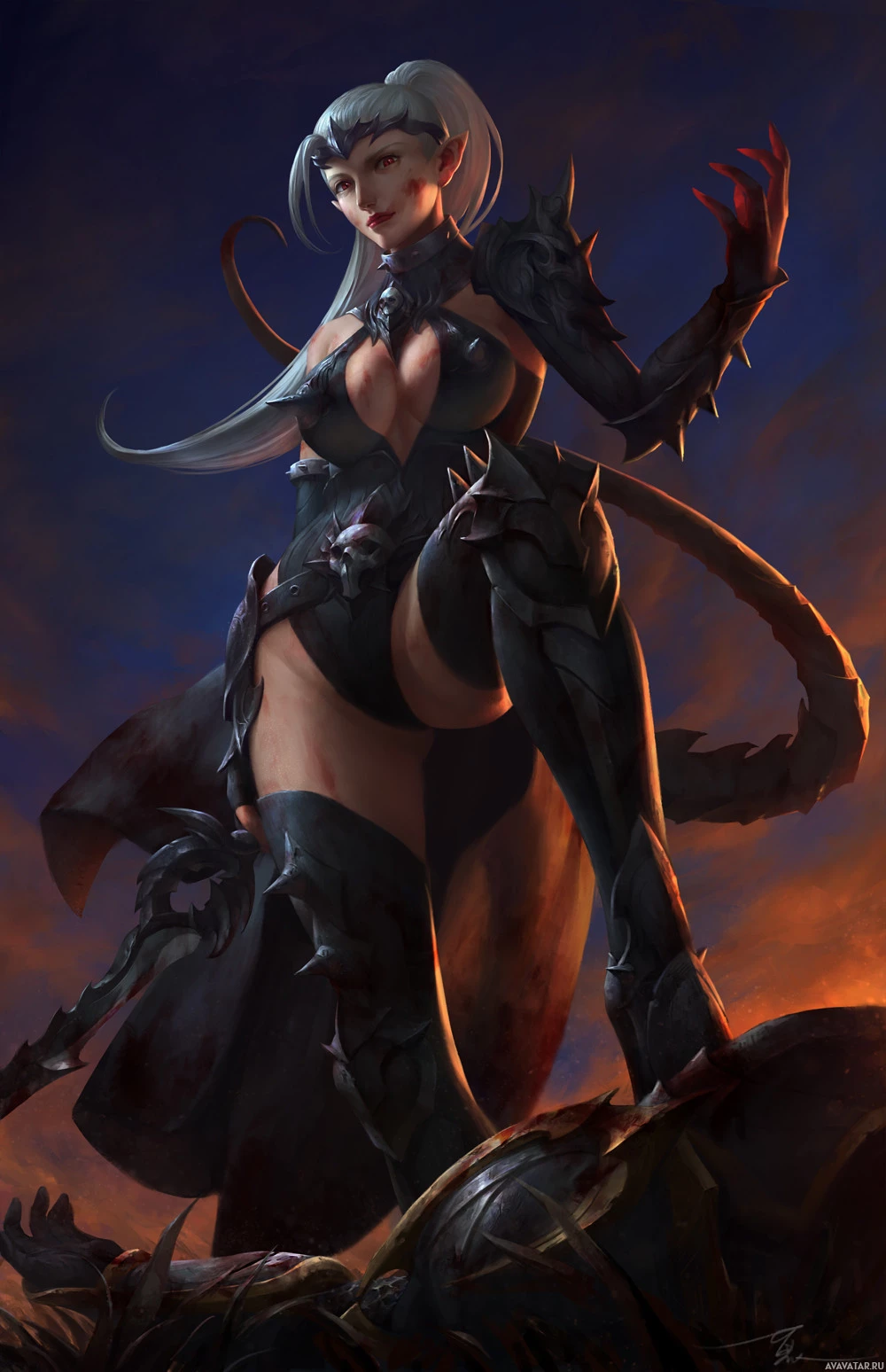 a fantasy character that appears to be an elf warrior. She is portrayed with silver hair, horns, and pointed ears, which are typical features for elves in