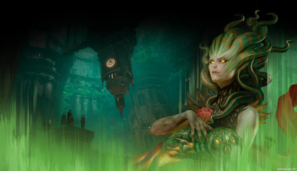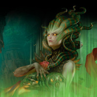 The image depicts a fantasy-themed artwork. It features a character with the appearance of Medusa, often associated with mythology or fantasy genres. The character is shown with snakes as part of her hair and