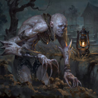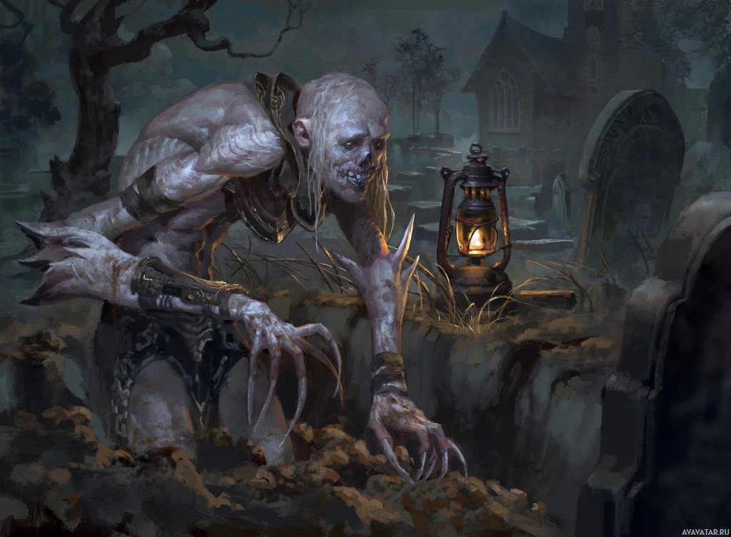 a ghastly creature, resembling a goblin or ghoul, in the foreground. It has