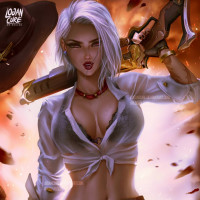 a white shirt, black pants, and holding what appears to be a weapon. The character is known as Ashe, one of